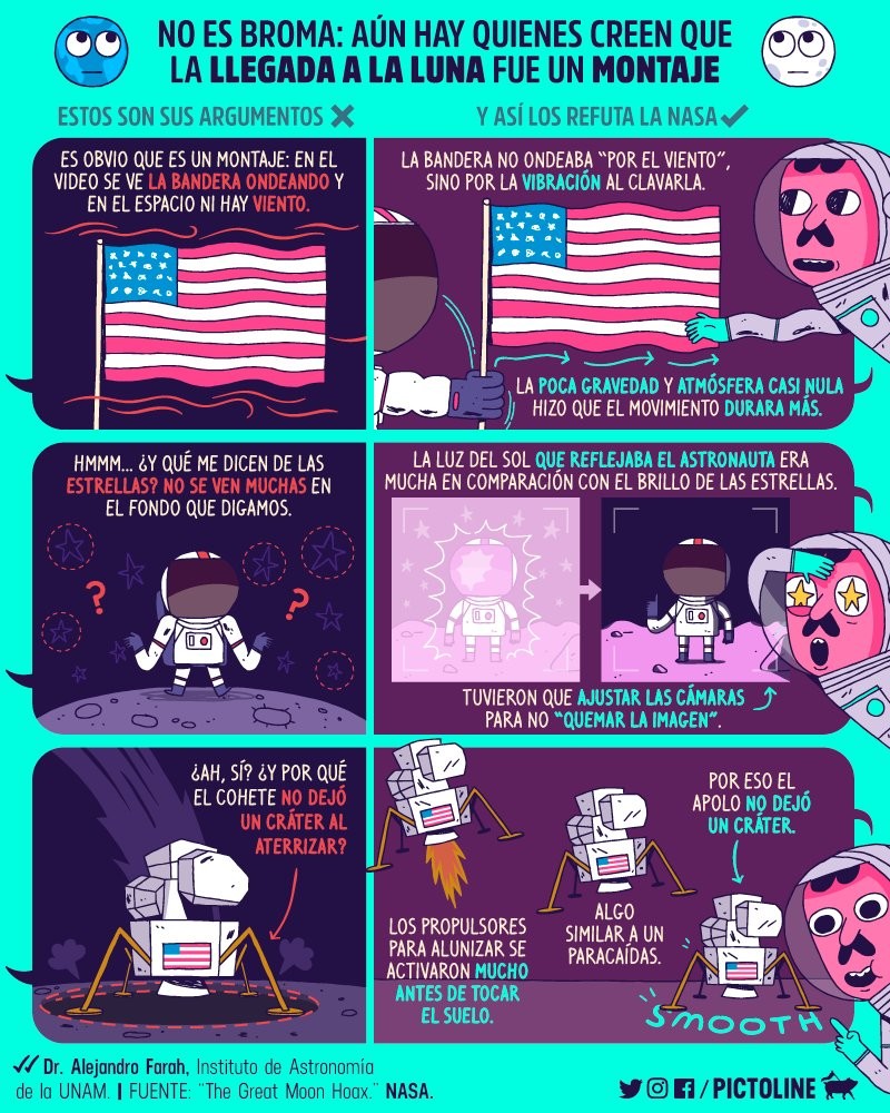 @maperal @satimonoupe Sin duda, ha sido un tema que ha despertado mucha polémica. Hay varias razones de ello, pero algunas se deben a que para justificar el alunizaje se dan explicaciones incorrectas, las cuales, lejos de disipar las dudas, las acrecientan. Por ejemplo, en la lámina, dice que los propulsores del módulo lunar se activaron mucho antes de tocar el suelo y luego insinúa que el descenso fue "algo similar a un paracaídas" (disminución de la velocidad de descenso producida por la fricción aerodinámica), lo cual de ninguna manera puede ser. En la Luna no hay atmósfera, por lo que esa analogía es inadmisible.