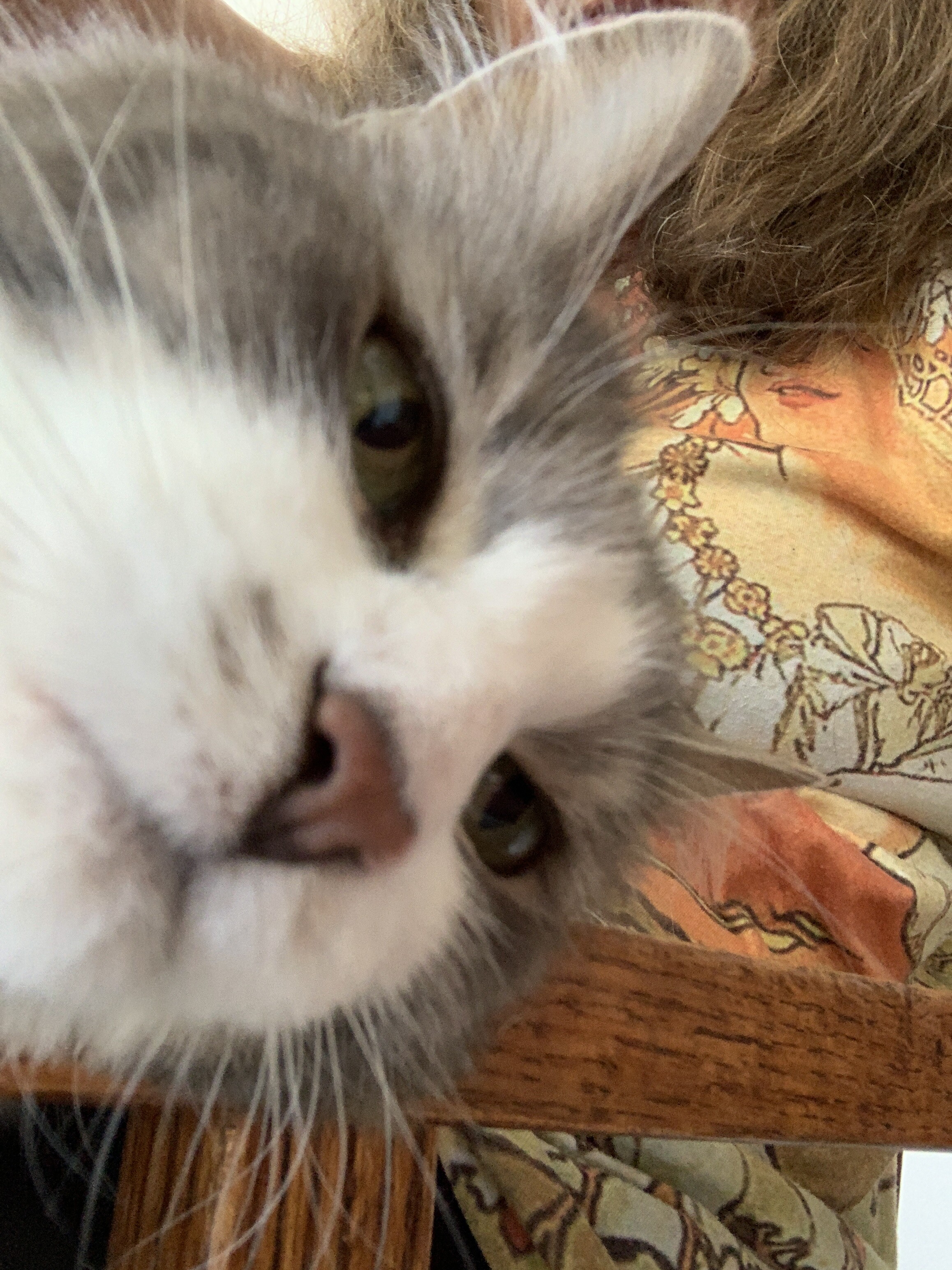 Sammy watching the birds from the new (gifted) comfy chair. You can’t tell, but he’s tiny…a compact ~8 lbs (Opal is smaller but looks bigger with her long body and long hair).