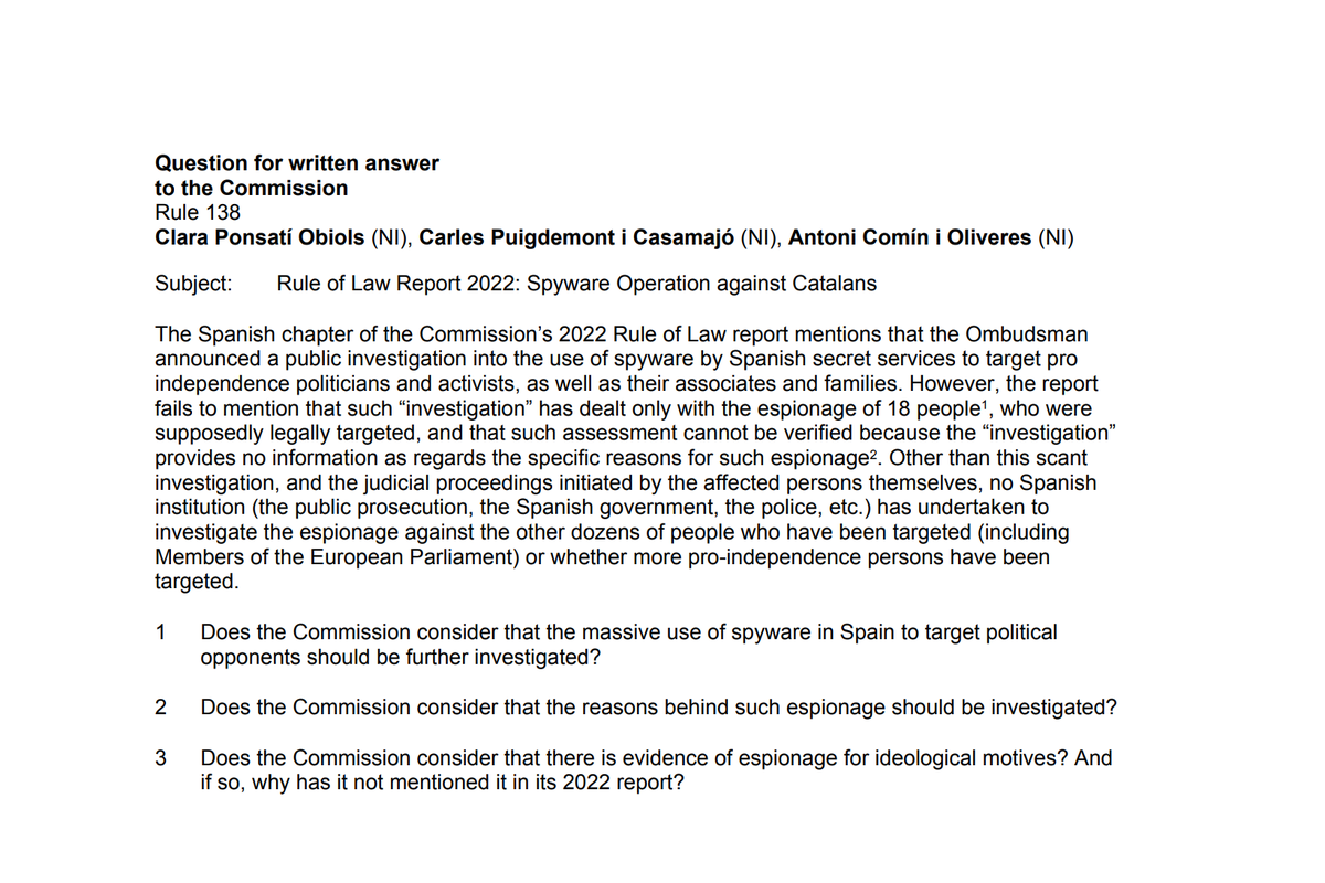♲ @ClaraPonsati@twitter.com:El cinisme i la hipocresia de la @EU_Commission pel que fa a l’estat de dret a Espanya és esgotador, però no podem deixar de denunciar-ho. Hem preguntat com és que, de nou, la Comissió no diu les coses pel seu nom pel que fa a l’escàndol de Pegasus. -