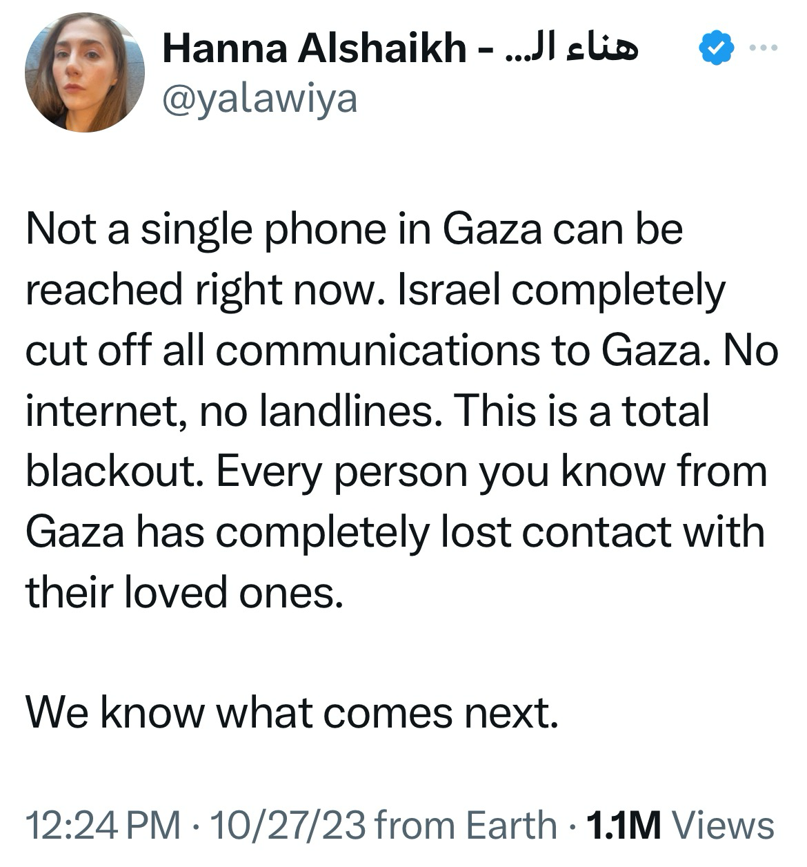 “Not a single phone in Gaza can be reached right now. Israel completely cut off all communications to Gaza. No internet, no landlines. This is a total blackout. Every person you know from Gaza has completely lost contact with their loved ones.