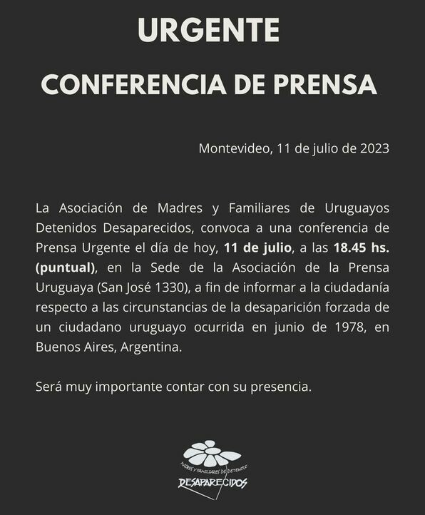 La Asociación de Madres y Familiares de Uruguayos Detenidos Desaparecidos, convoca a una conferencia de Prensa Urgente el día de hoy, 11 de julio, a las 18.45 hs., en la Sede de la Asociación de la Prensa Uruguaya (San José 1330), a fin de informar a la ciudadanía respecto a las circunstancias de la desaparición forzada de un ciudadano uruguayo ocurrida en junio de 1978, en Buenos Aires, Argentina.»