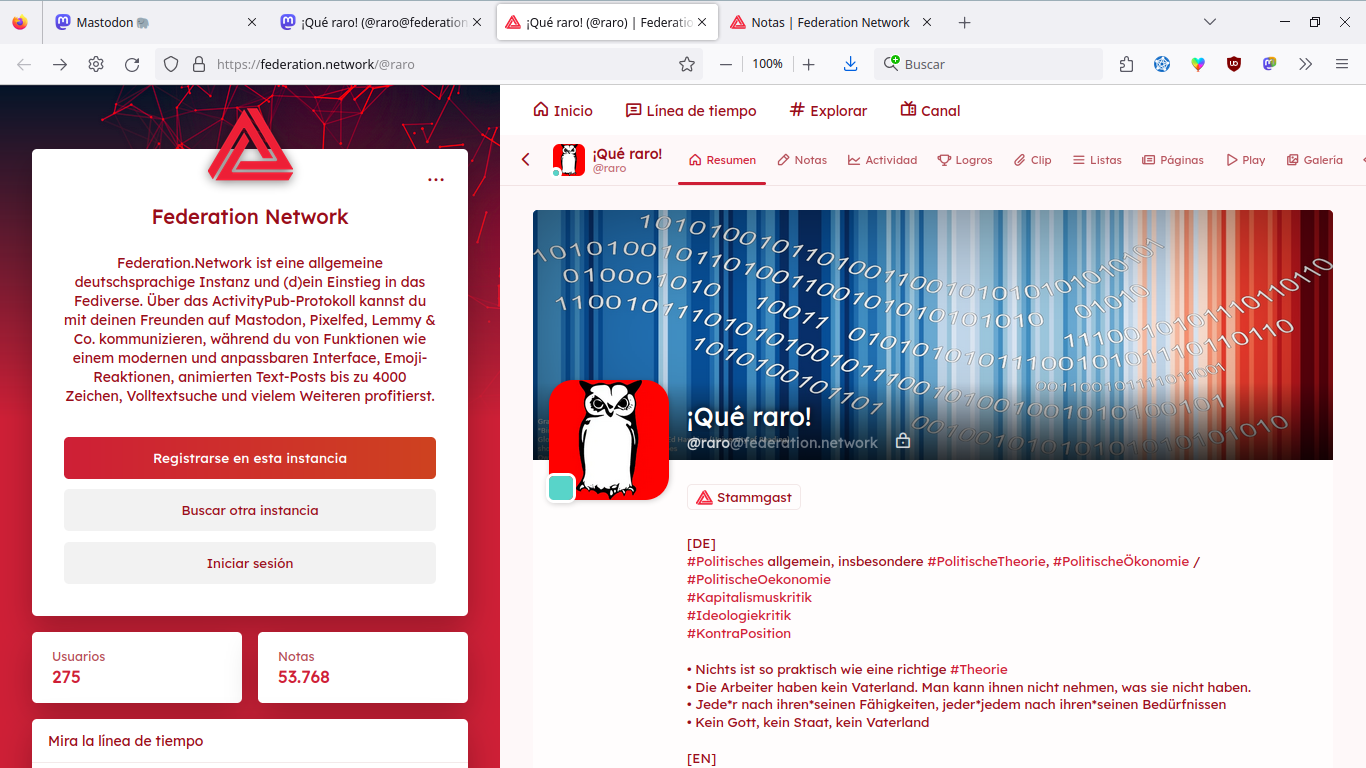 Red de federación Federation.Network es una instancia general de habla alemana y (d)una entrada al Fediverso. Usando el protocolo ActivityPub, puedes comunicarte con tus amigos en Mastodon, Pixelfed, Lemmy & Co. mientras te beneficias de funciones como una interfaz moderna y personalizable, reacciones emoji, publicaciones de texto animadas de hasta 4000 caracteres, búsqueda de texto completo y muchomas-