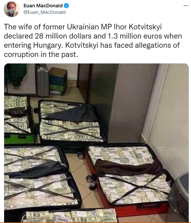 Wife of former ukrainian MP attempts to declare $28 million dollars and 1.3 million euro when entering Hungary. Ihor Kotvitskyi was a member of Ukraine's parliament from 2014-19 - post-Maidan during the years of Piotr Poroshenko's presidency - and has faced allegations of corruption in the past.