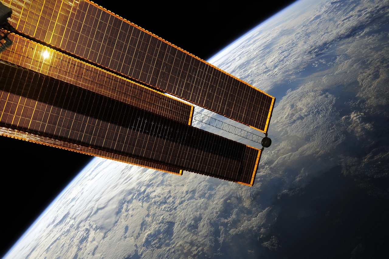 En la imagen: los paneles solares de la EEI captando la luz solar para convertirla en electricidad; al fondo, la Tierra. -